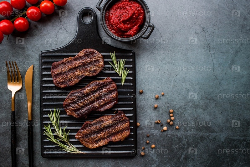 Свежее мясо. Жареные стейки из говядины с розмарином, специями и томатной пастой на стильной доске. Плоский вид сверху