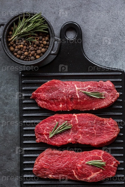 Свежее мясо. Стейки из сырой говядины с розмарином и специями на стильной доске. Плоский вид сверху