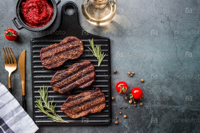 Свежее мясо. Жареные стейки из говядины с розмарином, специями и томатной пастой на стильной доске. Плоский вид сверху