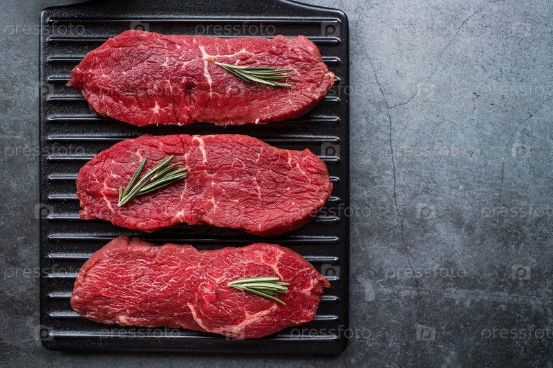 Свежее мясо. Стейки из сырой говядины на стильной доске. Плоский вид сверху