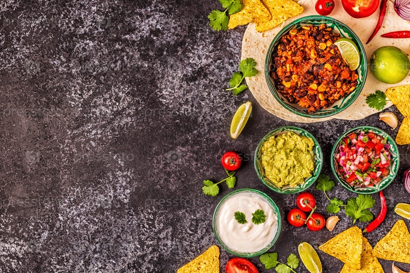 Концепция мексиканской кухни: лепешки, начос с гуакамоле, сальса