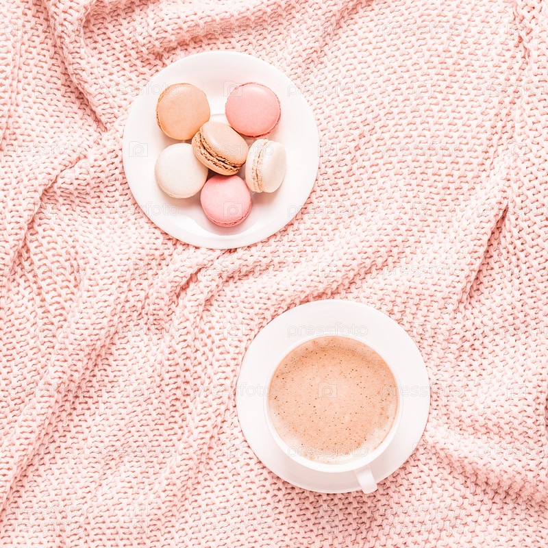 Фон с розовым пледом, кофе и миндальным печеньем