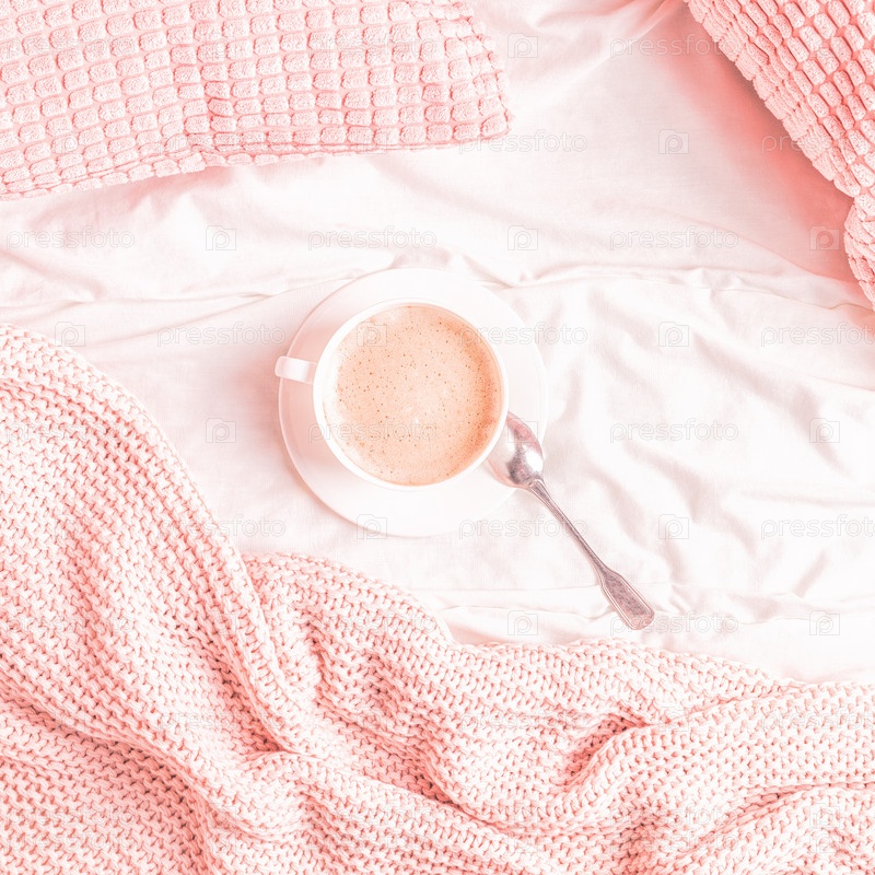 Кровать с розовым вязаным пледом и кофе