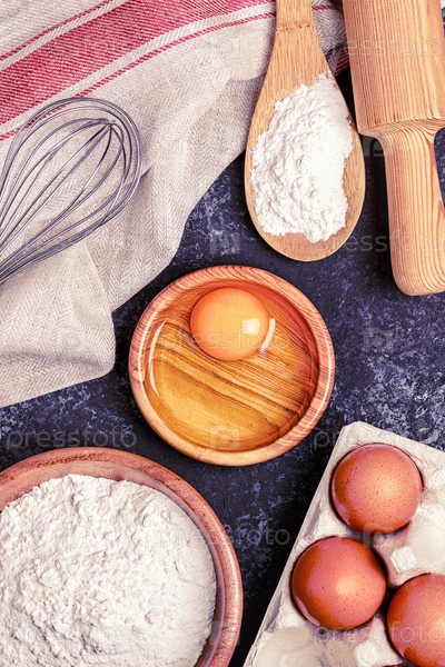 Ингредиенты для выпечки - мука, деревянная ложка, скалка, яйца