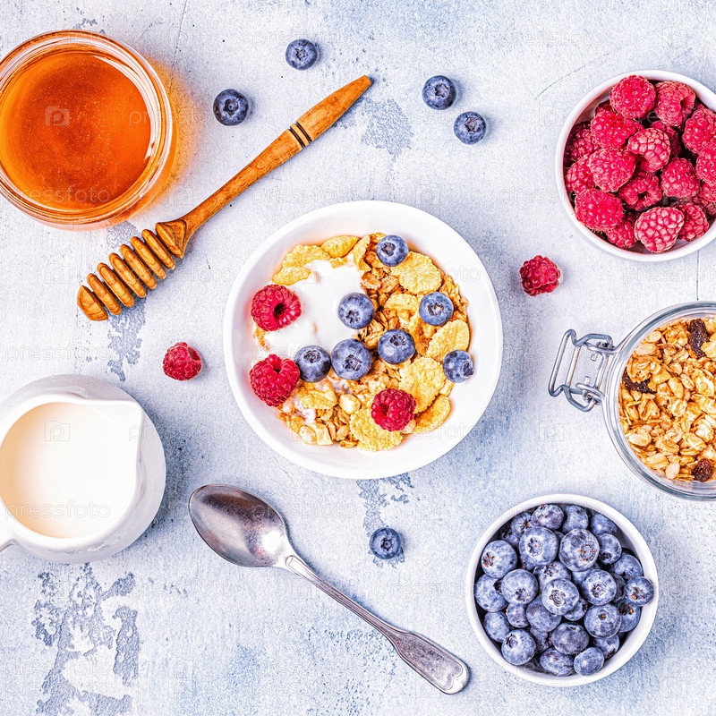 Здоровый завтрак, мюсли, хлопья с фруктами