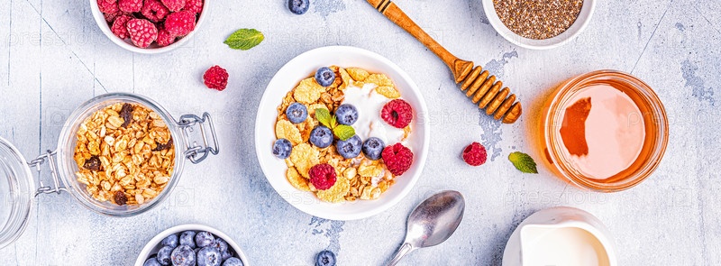 Здоровый завтрак, мюсли, хлопья с фруктами