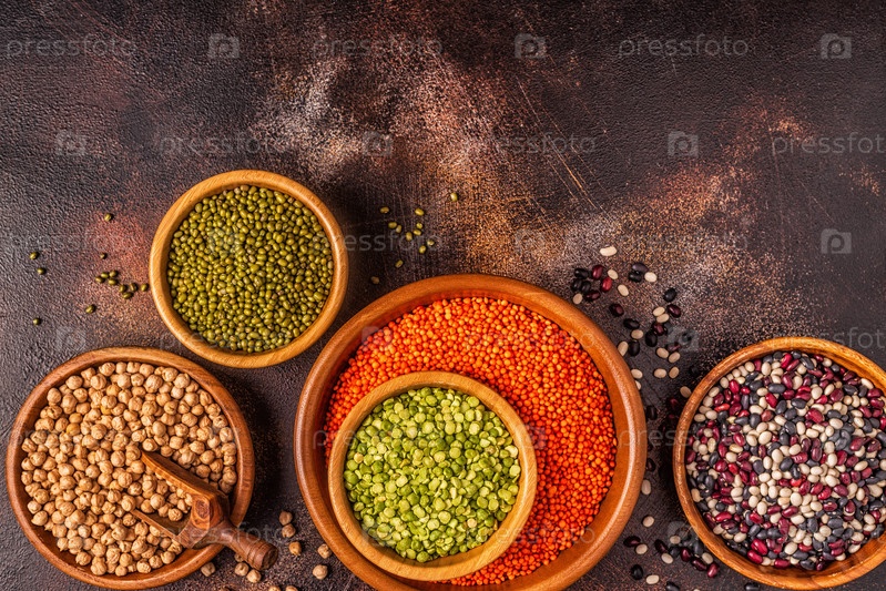 Ассортимент бобовых - чечевица, горох, мунг, нут и разные бобы