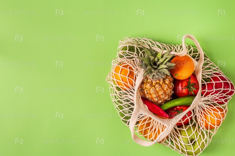 Свежие овощи и фрукты в сетке мешка