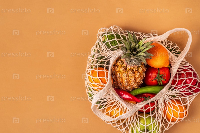Свежие овощи и фрукты в сетке мешка