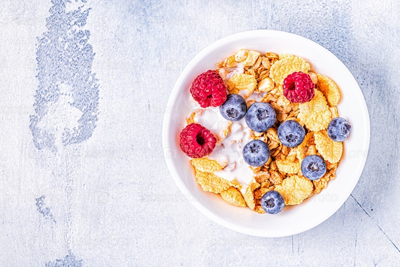 Здоровый завтрак, мюсли, хлопья с фруктами