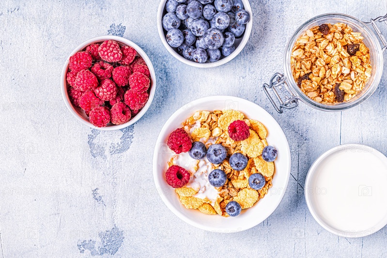 Здоровый завтрак, мюсли, хлопья с фруктами