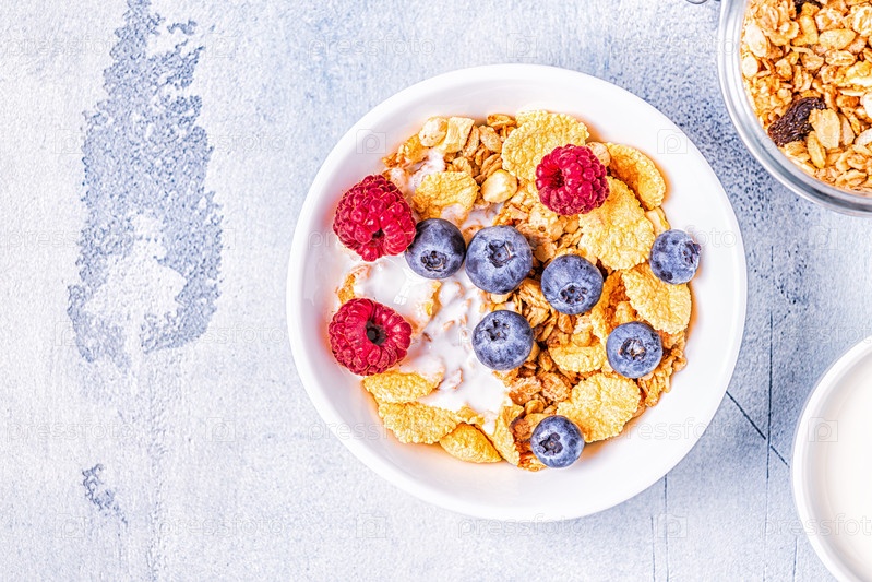 Здоровый завтрак, мюсли, хлопья с фруктами