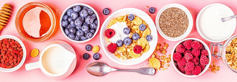 Здоровый завтрак, мюсли, хлопья с фруктами