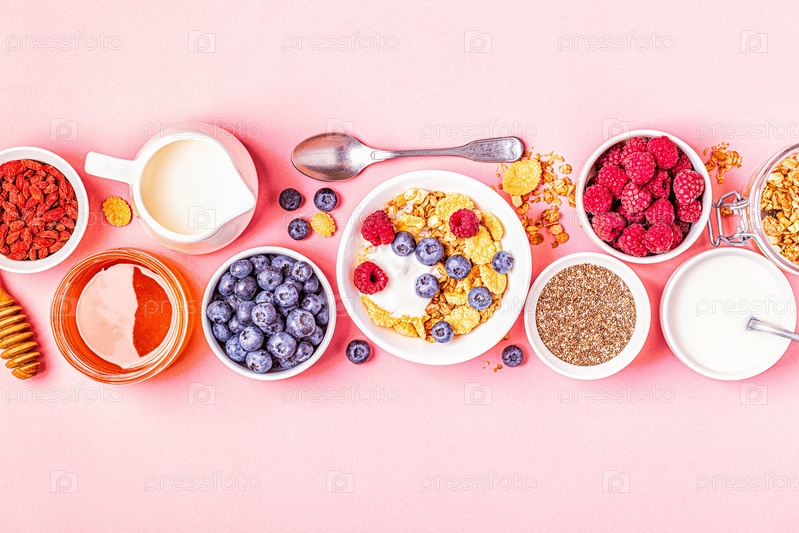 Здоровый завтрак, мюсли, хлопья с фруктами
