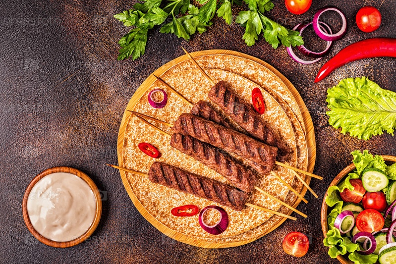 Традиционный ближневосточный, арабский или средиземноморский мясной шашлык с овощами и лавашем