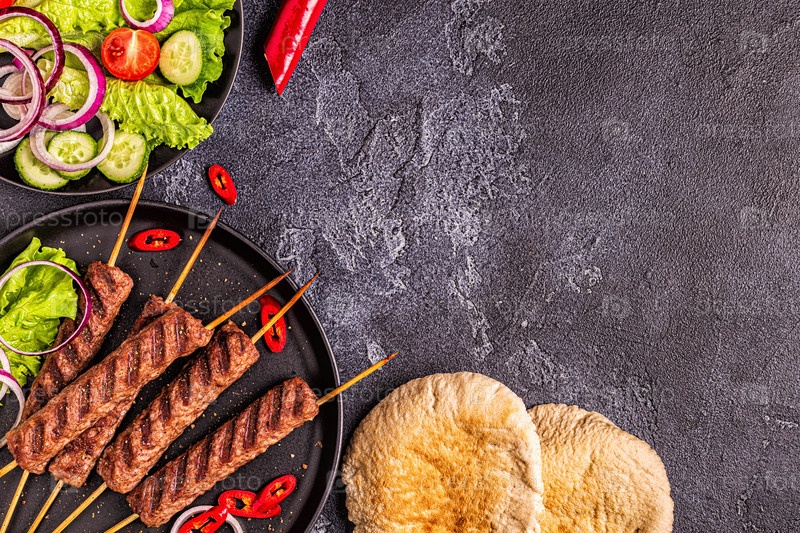 Традиционный ближневосточный, арабский или средиземноморский мясной шашлык с овощами и лавашом