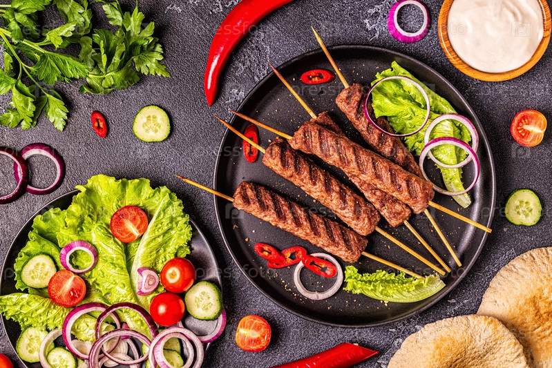 Традиционный ближневосточный, арабский или средиземноморский мясной шашлык с овощами и лавашом