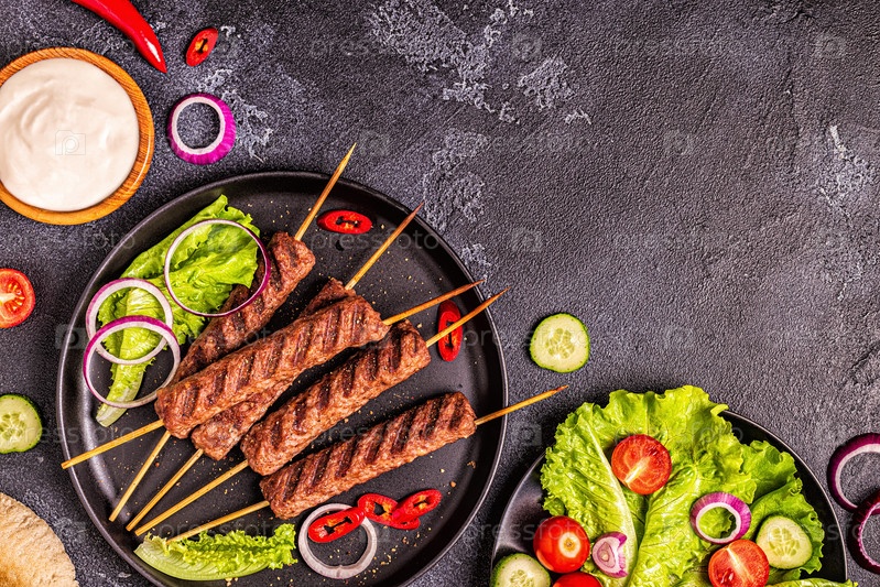 Традиционный ближневосточный, арабский или средиземноморский мясной шашлык с овощами и лавашом