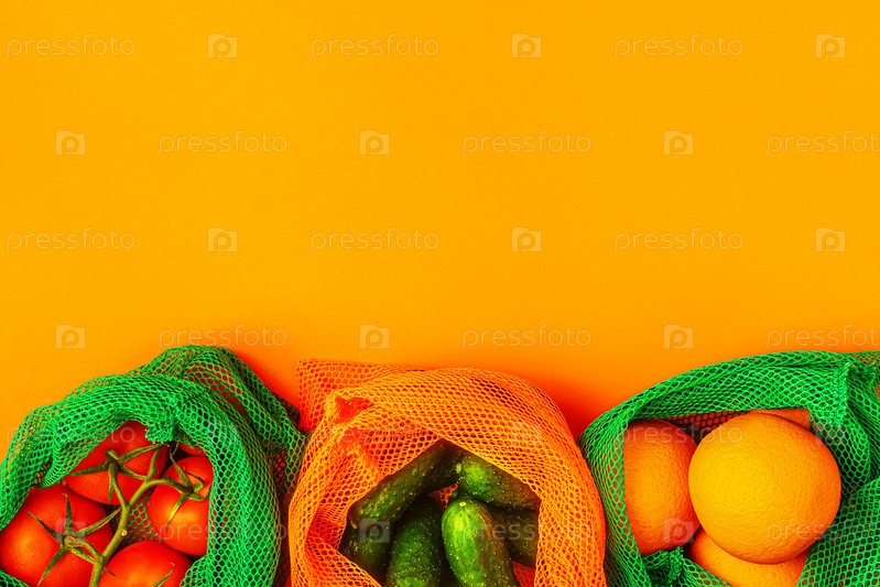 Свежие фрукты и овощи в многоразовых тканевых сетчатых мешках