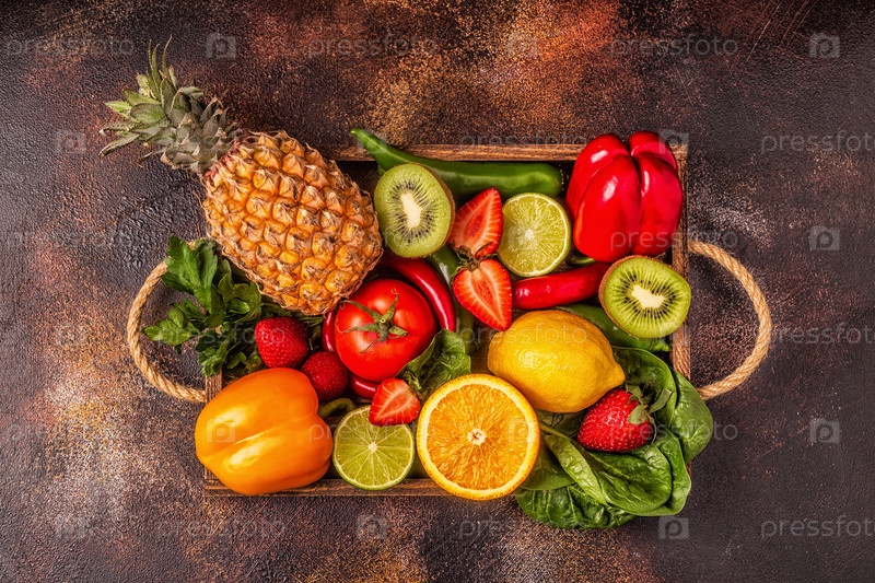 Фрукты и овощи, богатые витамином С, в коробке