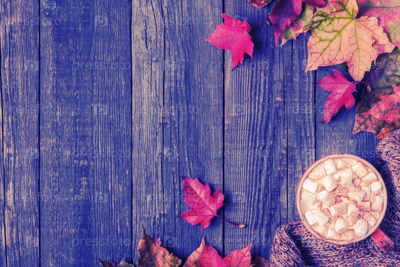 Осенний фон с горячим шоколадом, вязаный шарф, разноцветные листья