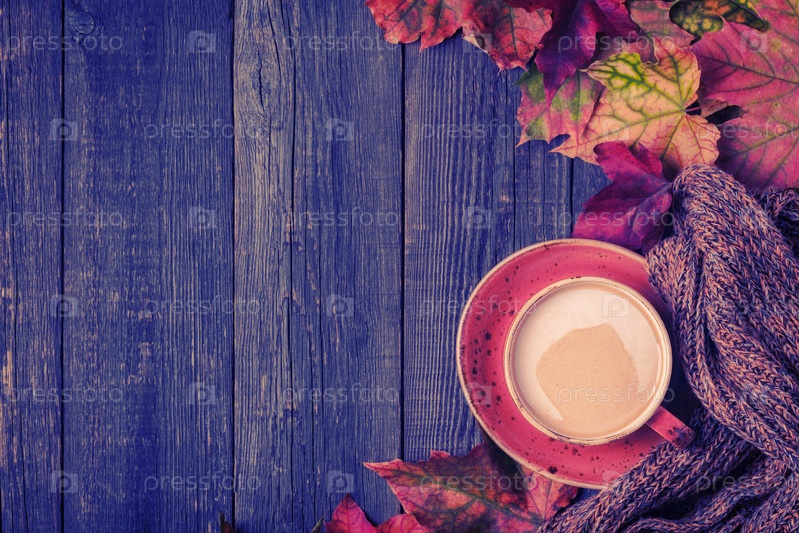 Осенний фон с горячим шоколадом, вязаный шарф, разноцветные листья