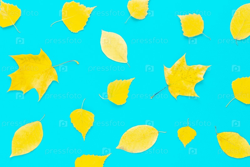 Осенние желтые листья на синем фоне