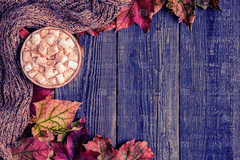 Осенний фон с горячим шоколадом, вязаный шарф, разноцветные листья