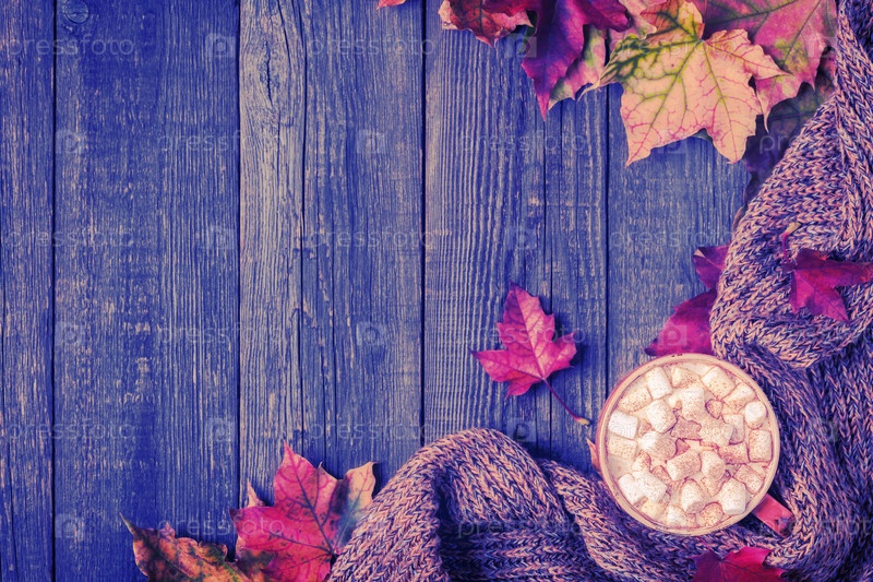 Осенний фон с горячим шоколадом, вязаный шарф, разноцветные листья