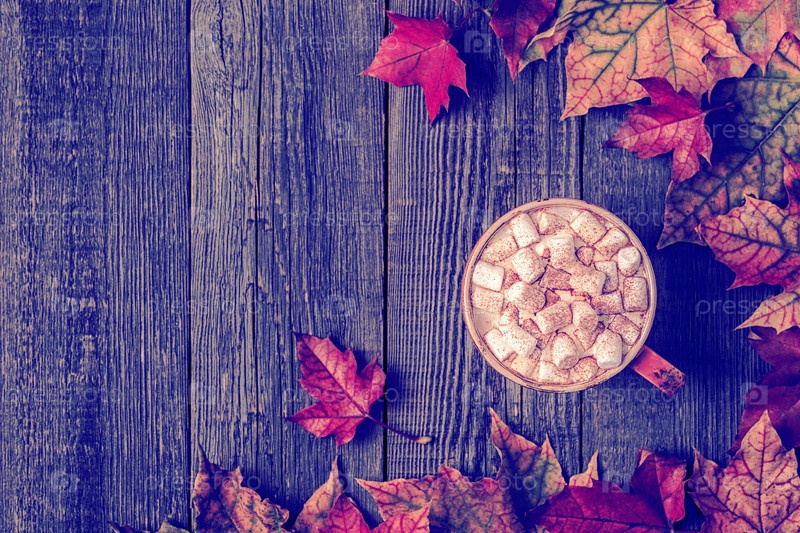 Осенний фон с горячим шоколадом, вязаный шарф, разноцветные листья