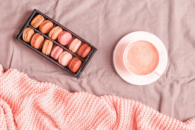 Кровать с розовым вязаным пледом, кофе и миндальным печеньем