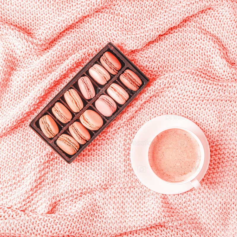 Фон с розовым пледом, кофе и миндальным печеньем