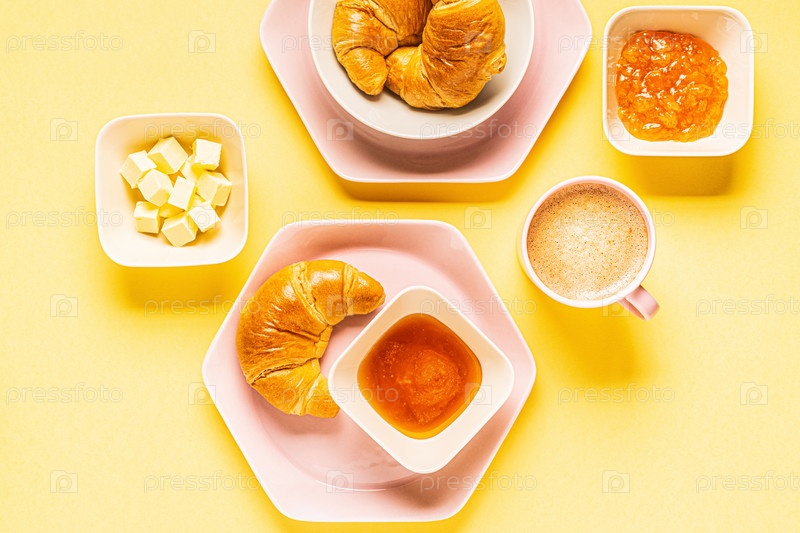 Кофе и круассаны на завтрак на желтом фоне