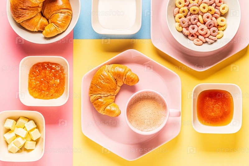Кофе и круассаны на ярком модном фоне