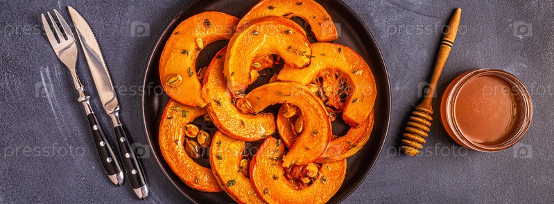 Запеченные ломтики тыквы на темном фоне