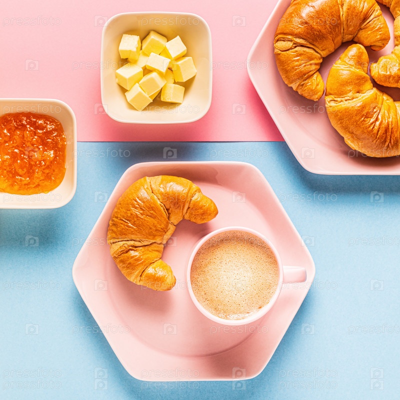 Кофе и круассаны на ярком модном фоне