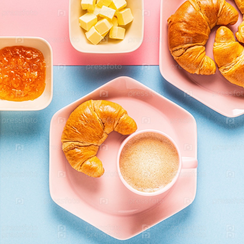 Кофе и круассаны на ярком модном фоне