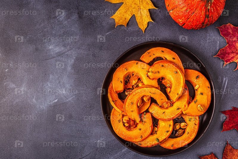 Запеченные ломтики тыквы на темном фоне
