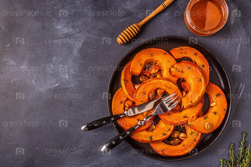 Запеченные ломтики тыквы на темном фоне