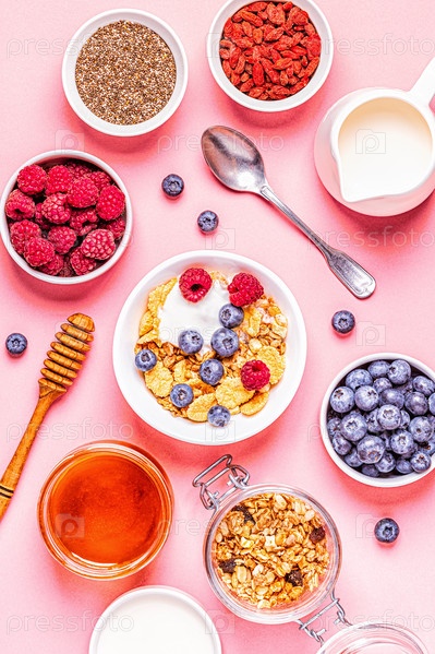 Здоровый завтрак, мюсли, хлопья с фруктами