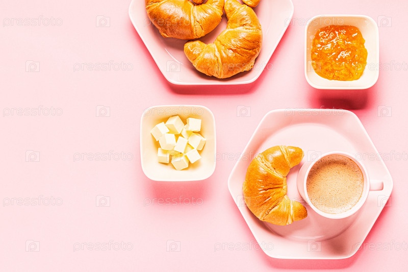 Кофе и круассаны на завтрак на розовом фоне