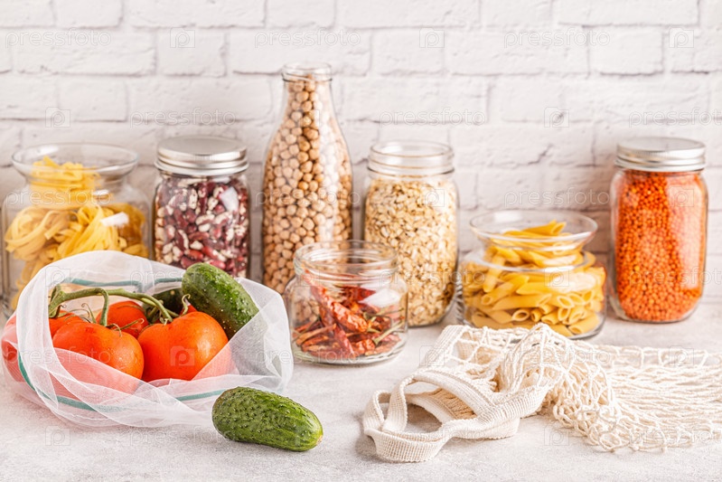 Изделия в тканевых мешках, стеклянная посуда. Экологичные покупки и хранение продуктов