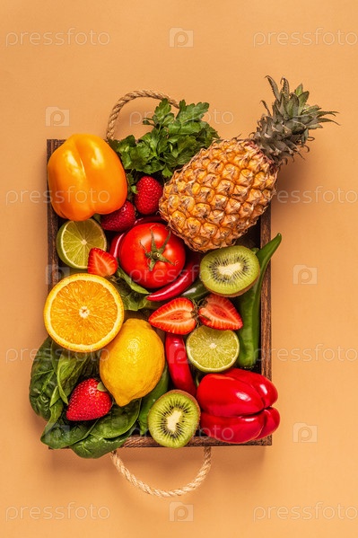 Фрукты и овощи, богатые витамином С, в коробке