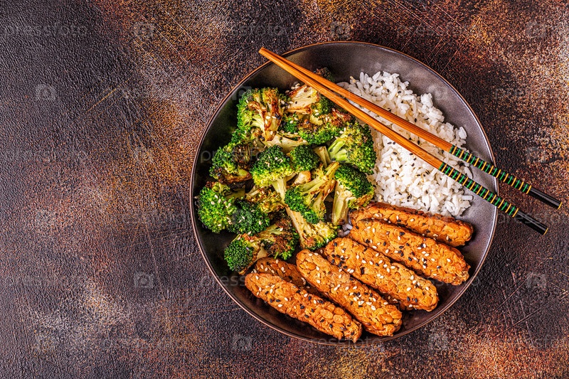 Жареный темпе с рисом и брокколи
