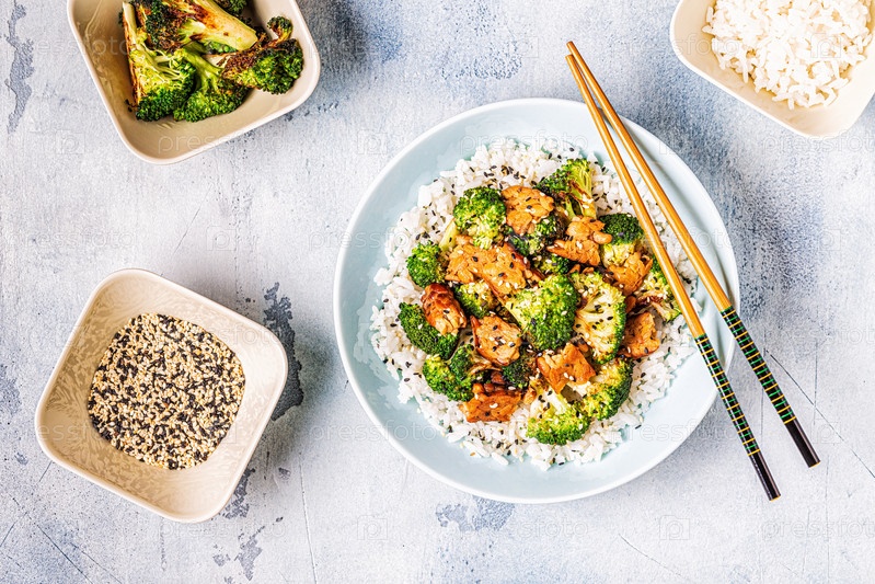 Жареный темпе с рисом и брокколи