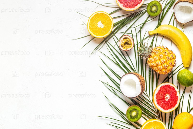 Тропические фрукты и пальмовые листья на белом фоне