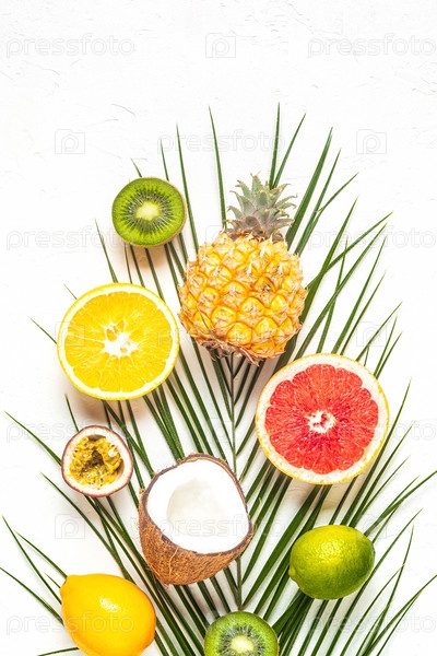 Тропические фрукты и пальмовые листья на белом фоне
