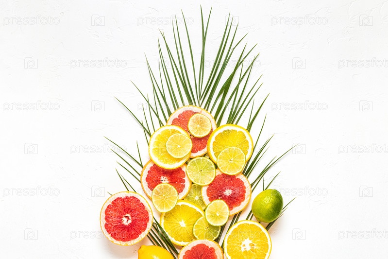 Тропические фрукты и пальмовые листья на белом фоне