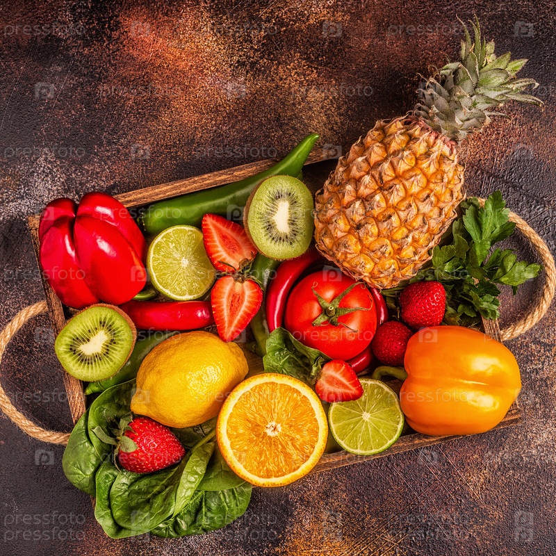 Фрукты и овощи, богатые витамином С, в коробке