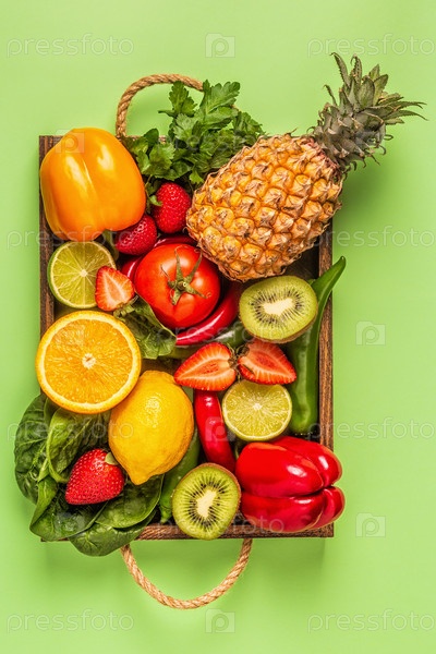Фрукты и овощи, богатые витамином С, в коробке